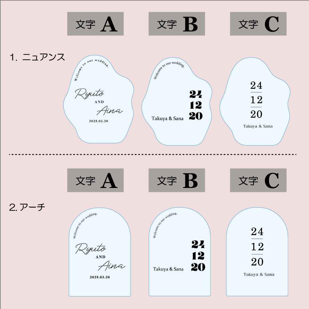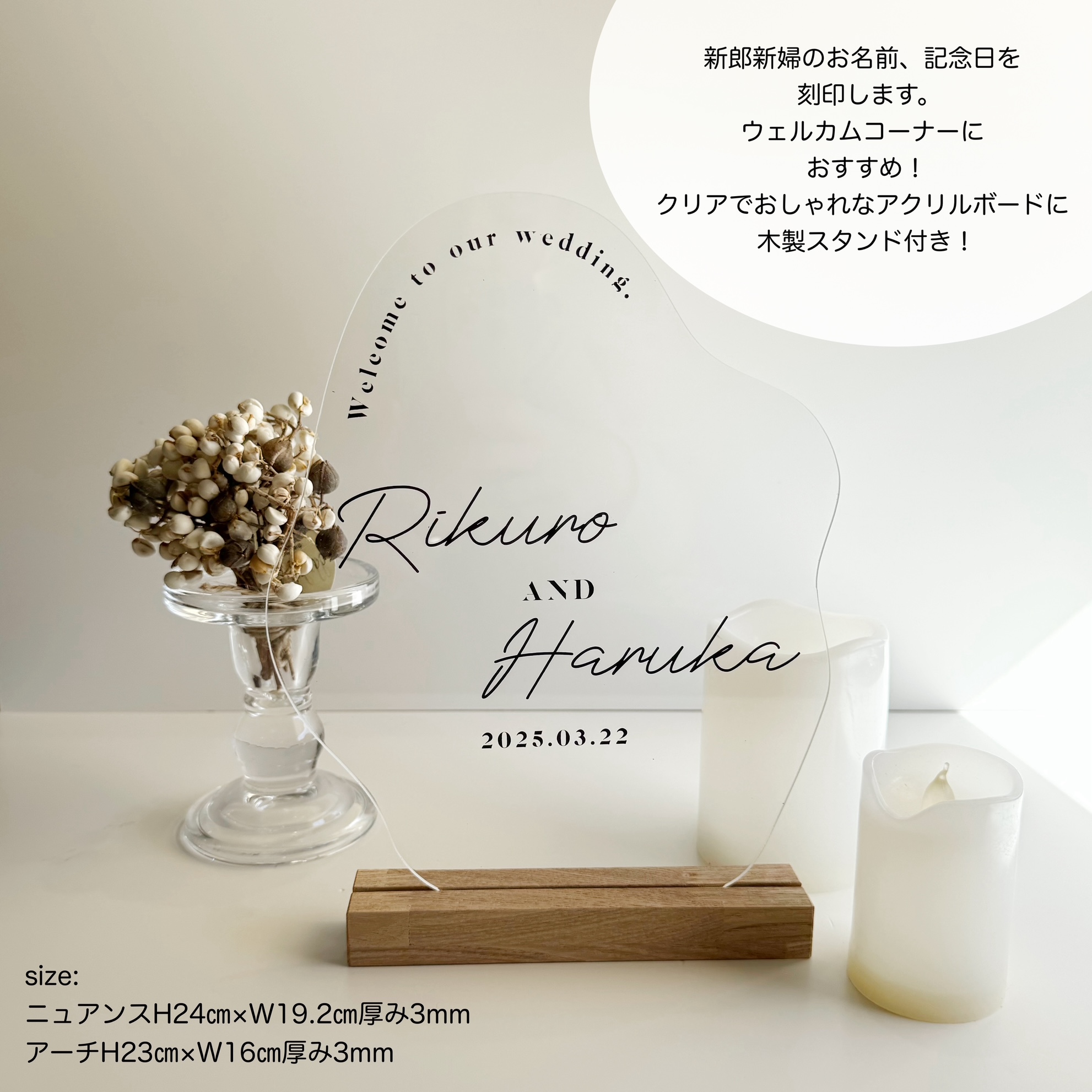 アクリル製ウェルカムボードです。新郎新婦のお名前、記念日を刻印できます。